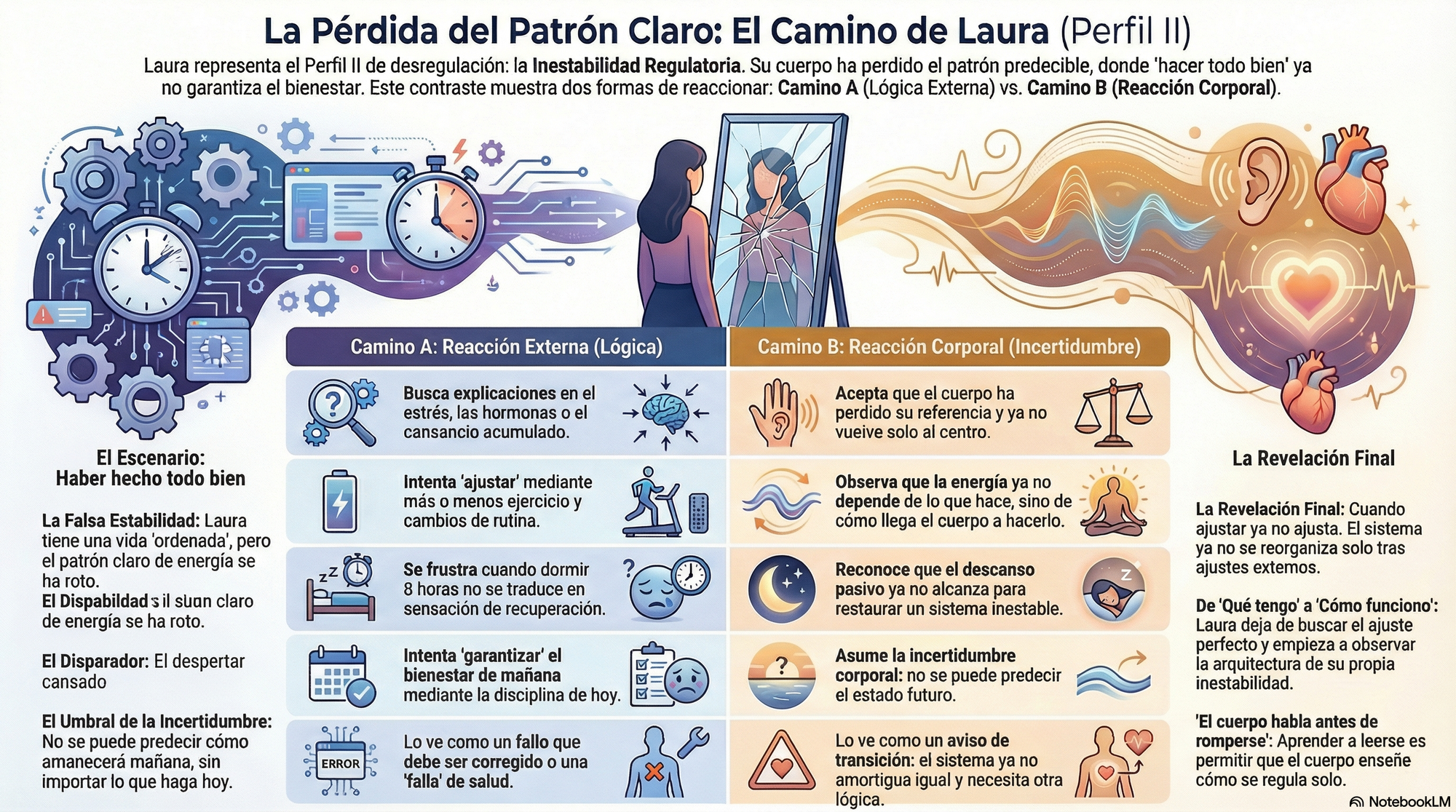 Basándose en el registro clínico de la Historia 8, el punto de inflexión se manifiesta cuando se fractura la correlación entre el input (el hábito) y el output (el estado resultante). Laura entra en lo que denominamos Incertidumbre Corporal: la pérdida de la capacidad neurobiológica para predecir el estado del sistema al día siguiente, independientemente de las acciones correctas realizadas hoy.