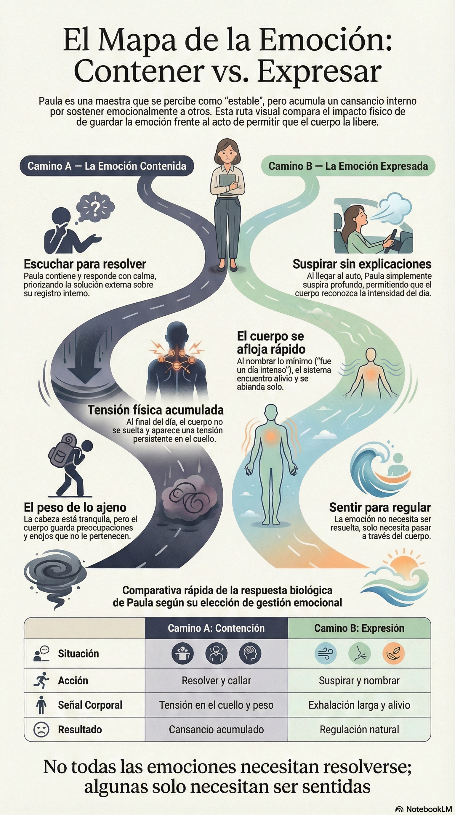- ¿Lo que siento se va… o se queda en algún lado? Busca revelar que la resolución lógica de un evento no garantiza su liberación orgánica; el sistema puede dar por "cerrado" un tema mientras el cuerpo sigue sosteniendo la carga.